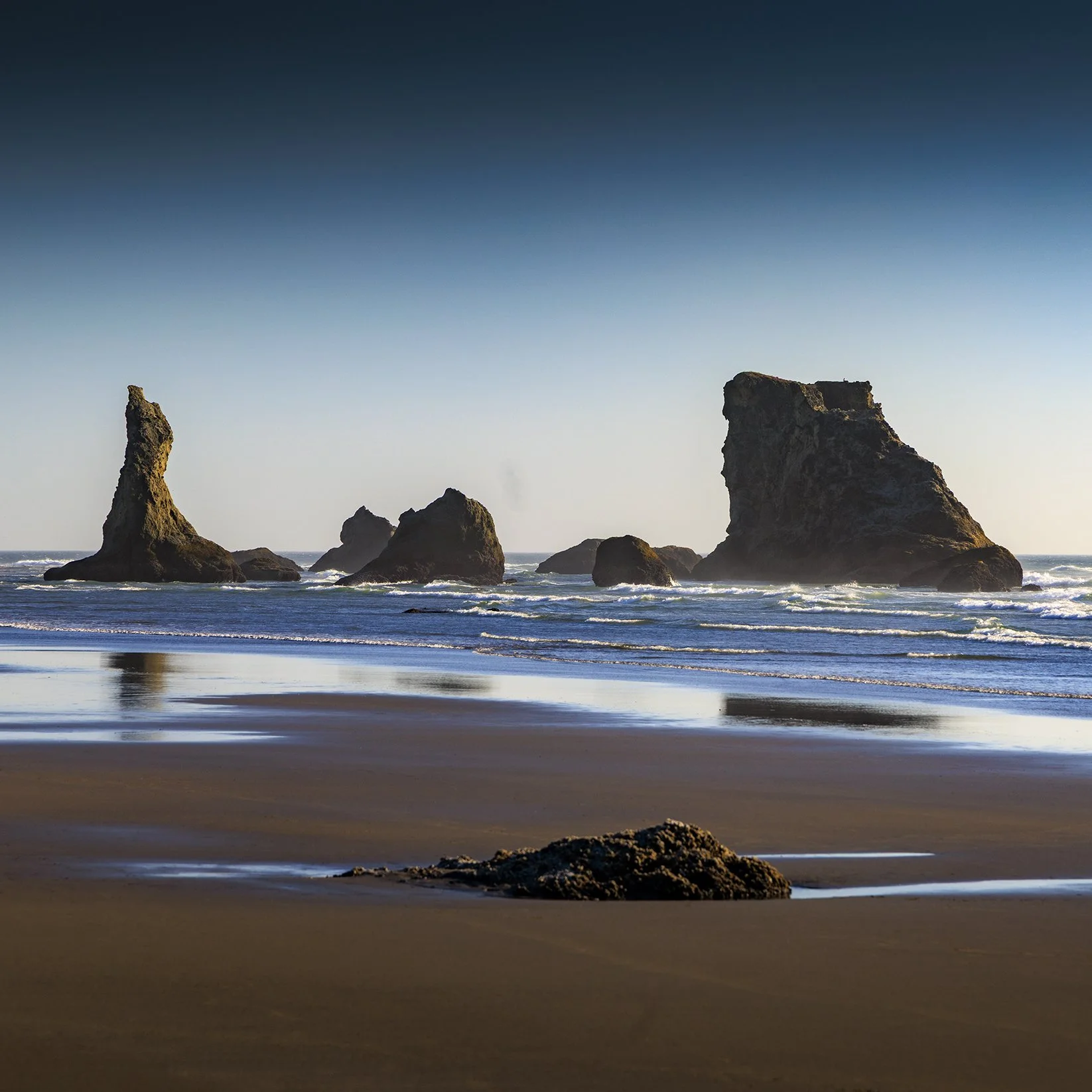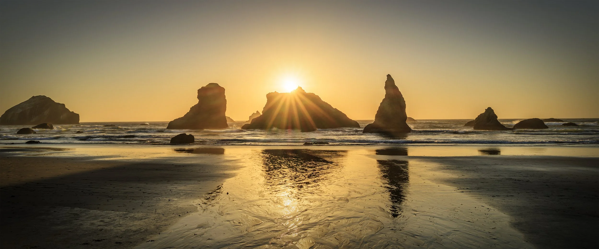 To create the image I maximized the warm sunset tones of the sky combined with the sun star to increase the significance of the silhouetted sea stacks. I combined that with reflections of the stacks in water flowing down the beach to add depth and provide a leading flow towards the rocks.