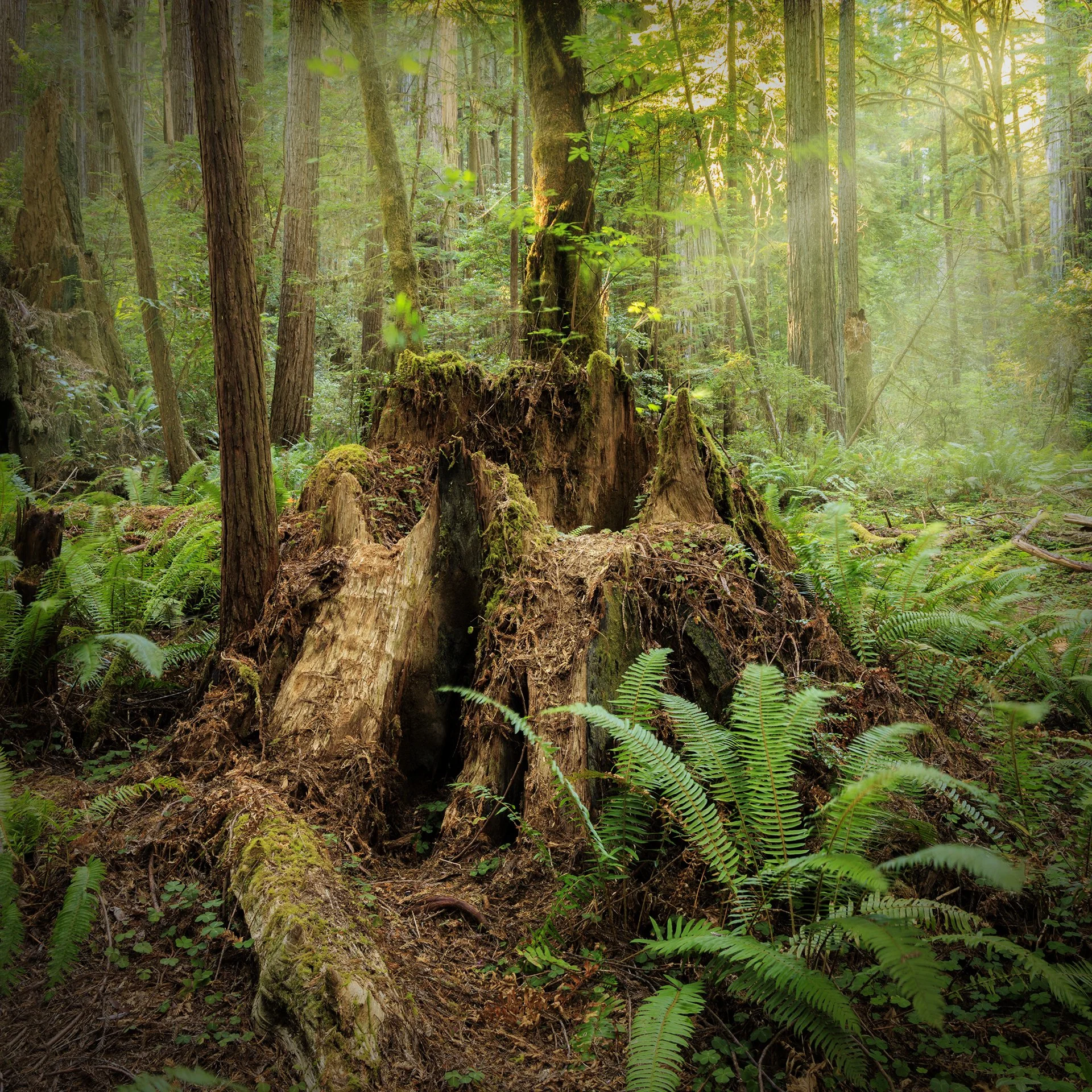 I like the dimensionality of it with a foreground, middle ground with subject, and then a background softened by mist with warm light rays coming into the frame from the left and highlighting the stump.