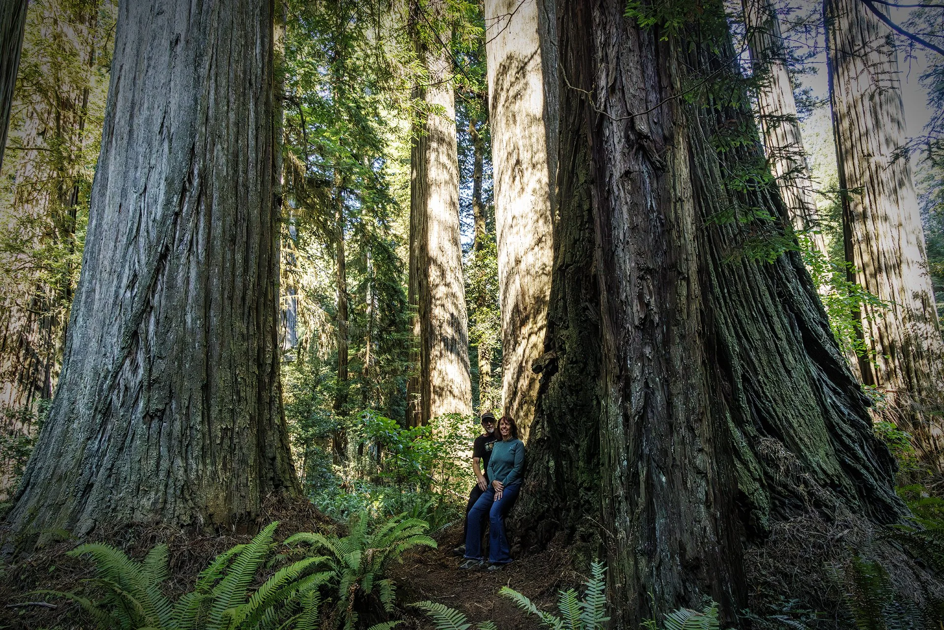 In this photo I mostly ignored the chaos problem. I did try to resolve the scale issue. The only way I know to show the scale of these trees is to include people in the image. So, that's what I did. Here we are among the redwoods. Can you even see us?