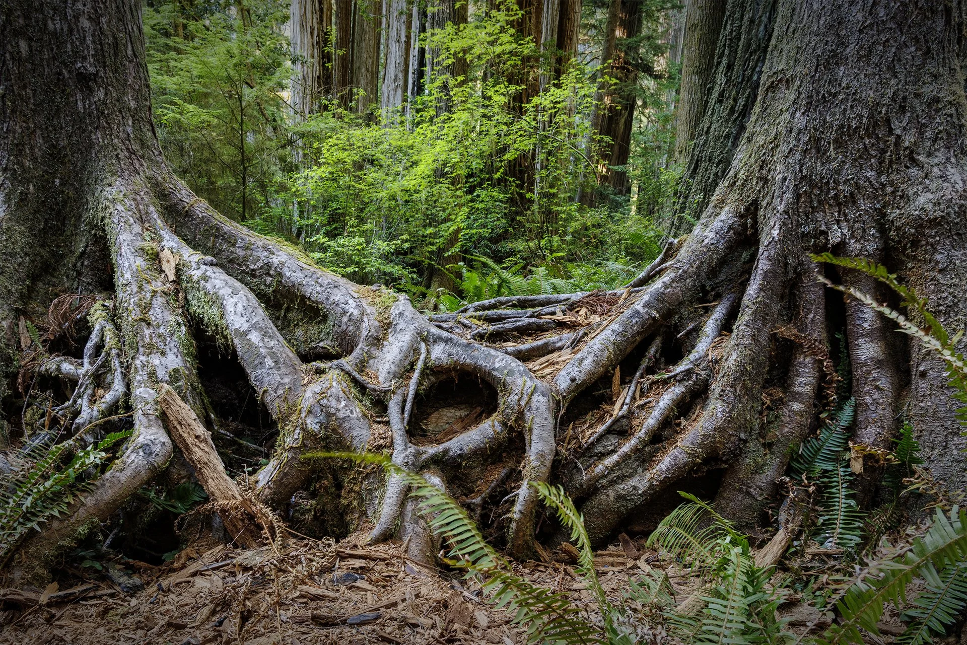 The problem with photographing redwoods is two-fold. First, you have the usual problem of photographing in woodlands where you have to find some way to make sense of the chaos of the forest. Second, you have the problem of how to give an idea of the scale of things in the photo.