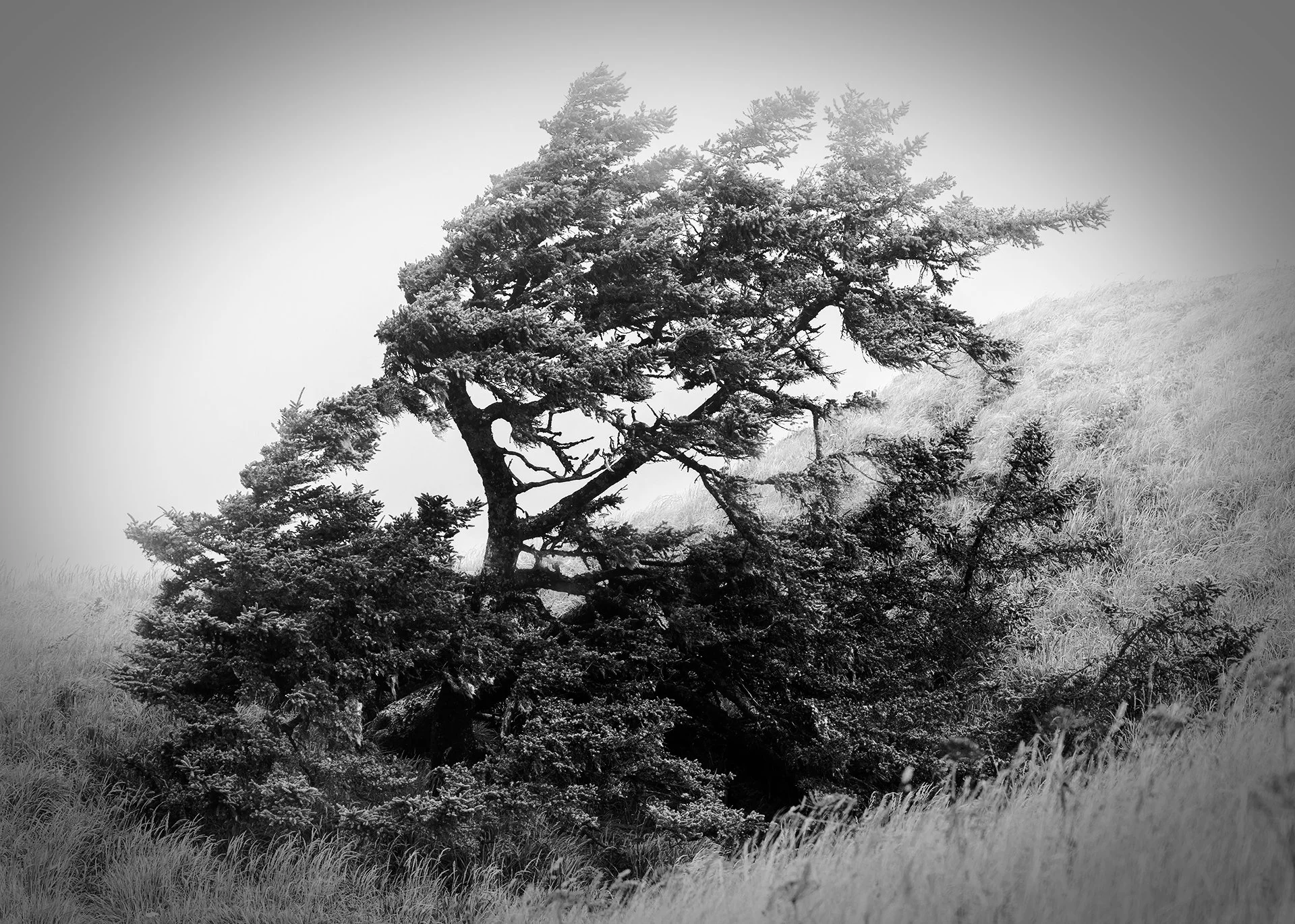 Wind Blasted Tree in Fog